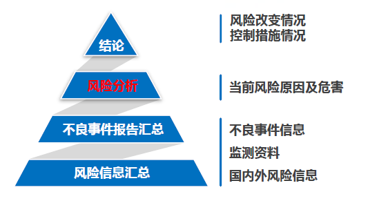 3、評價(jià) 對風(fēng)險(xiǎn)信息的匯總; 對不良事件監(jiān)測信息進(jìn)行的分析 對其他風(fēng)險(xiǎn)信息的綜合 對上市后風(fēng)險(xiǎn)的評價(jià):風(fēng)險(xiǎn)是否有變化、是否可接受 4、報(bào)告 報(bào)告應(yīng)當(dāng):完整、規(guī)范化;有邏輯結(jié)構(gòu)(介紹、數(shù)據(jù)、分析、結(jié)論);可識別(日期、版本、注冊人與聯(lián)系人等);