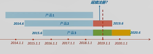 問:若產(chǎn)品2在藍(lán)色箭頭時(shí)間點(diǎn)進(jìn)行了延續(xù)注冊,定期風(fēng)險(xiǎn)評價(jià)報(bào)告要如何提交呢? 答:這是一種特殊情況。在1號令生效時(shí),該產(chǎn)品已經(jīng)處于延續(xù)注冊狀態(tài)。所以對于這類情況,2019年的年度定期風(fēng)險(xiǎn)評價(jià)報(bào)告就不用提交了。
